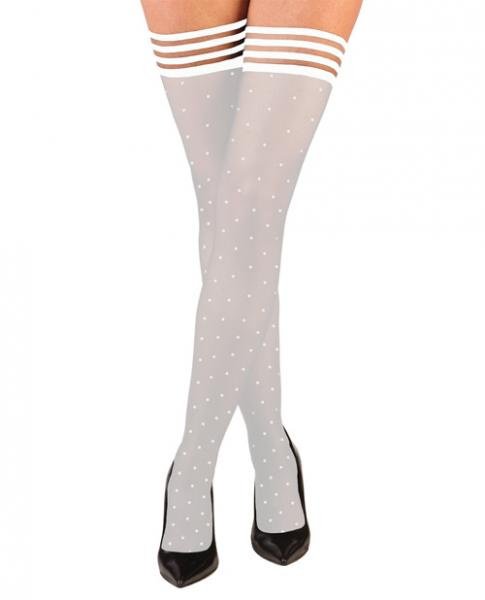 Add a touch of whimsy to your wardrobe with these polka dot thigh-high tights from Kixies. Sleek, slender, and stylish, they bring personality to any outfit—whether at work or play.